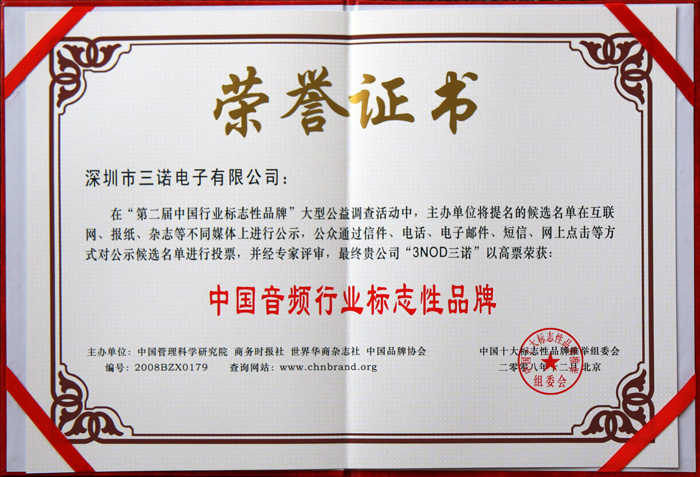 在本次颁奖典礼上,深圳市三诺电子有限公司荣获“中国音频行业标志性品牌”,董事长刘志雄先生荣获“影响2008-中国时代十大创新商业领袖”,副总裁李菲小姐荣获“影响2008-中国行业杰出经理人”,硕果丰盛,令人瞩目。