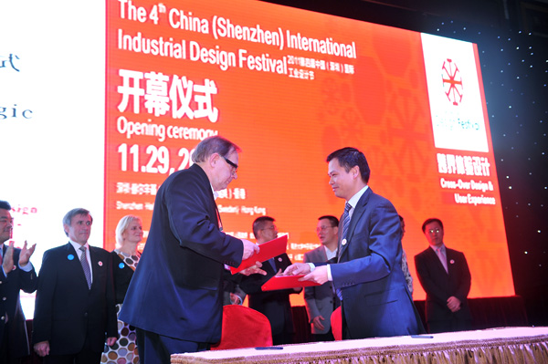深圳市工业设计协会会长、三诺集团董事长刘志雄代表深圳方与芬兰赫尔辛基设计师协会主席塔帕尼·海万恩先生(Tapani Hyv nen) 签署《深圳·赫尔辛基设计战略合作协议》