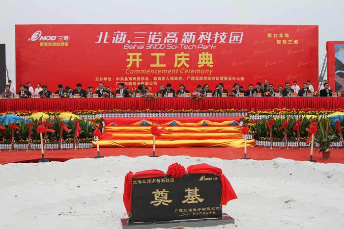 北海三诺高新科技园是广西壮族自治区与北海市两级政府推进的重大电子信息产业项目。2011年5月14日, 广西自治区主席马飚亲自率领自治区有关部门和北海市领导赴三诺集团深圳总部考察指导,现场办公,短短15日内,今年5月28日,在马飙主席的亲自见证下,北海三诺项目顺利签约,庆典仪式上,马飚主席又专门发来贺信,对北海三诺高新科技园的开工建设表示祝贺。广西自治区人民政府副秘书长魏然宣读了贺信。广西自治区有关单位领导、中直驻桂有关单位领导,北海市辖县区和北海市直部门领导,北海工业园区管委会全体干部职工、三诺供应商伙伴及嘉宾等共600多人出席开工庆典仪式。