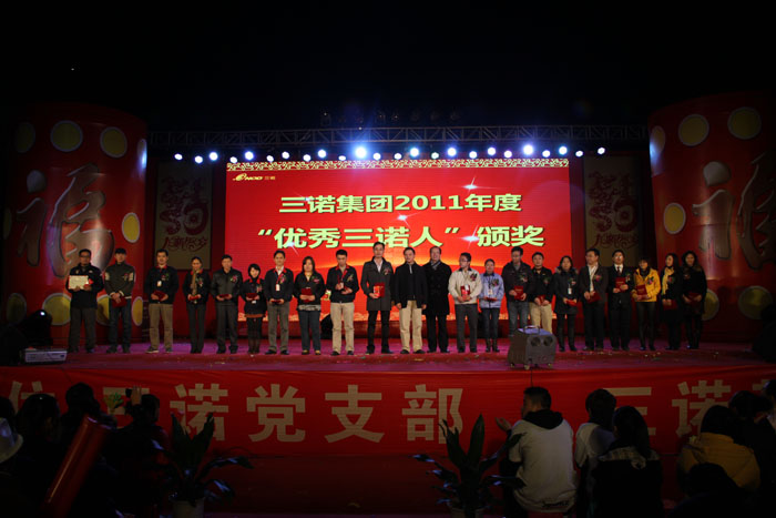 晚会共分为两个部分进行:“优秀三诺人”颁奖及穿插抽奖游戏的精彩节目表演。为了嘉奖先进、更为激励全体同仁在新的一年里再创佳绩,晚会特设了“优秀三诺人”颁奖环节,由三诺集团董事长刘志雄、三诺集团副总裁/三诺电子总经理梁立修向优秀三诺人颁发了证书和奖金,“优秀三诺人”代表与大家分享了获奖心得体会。