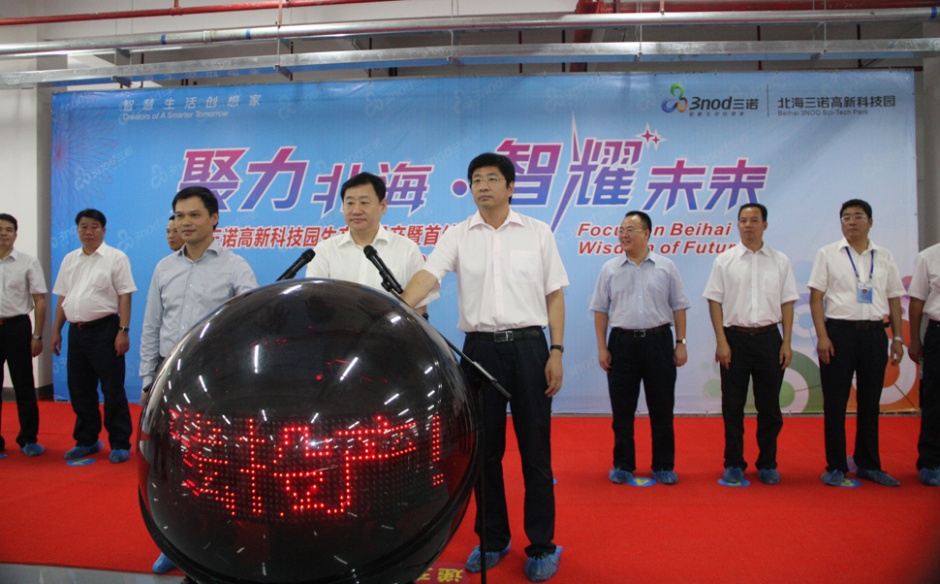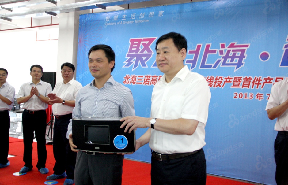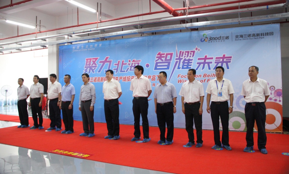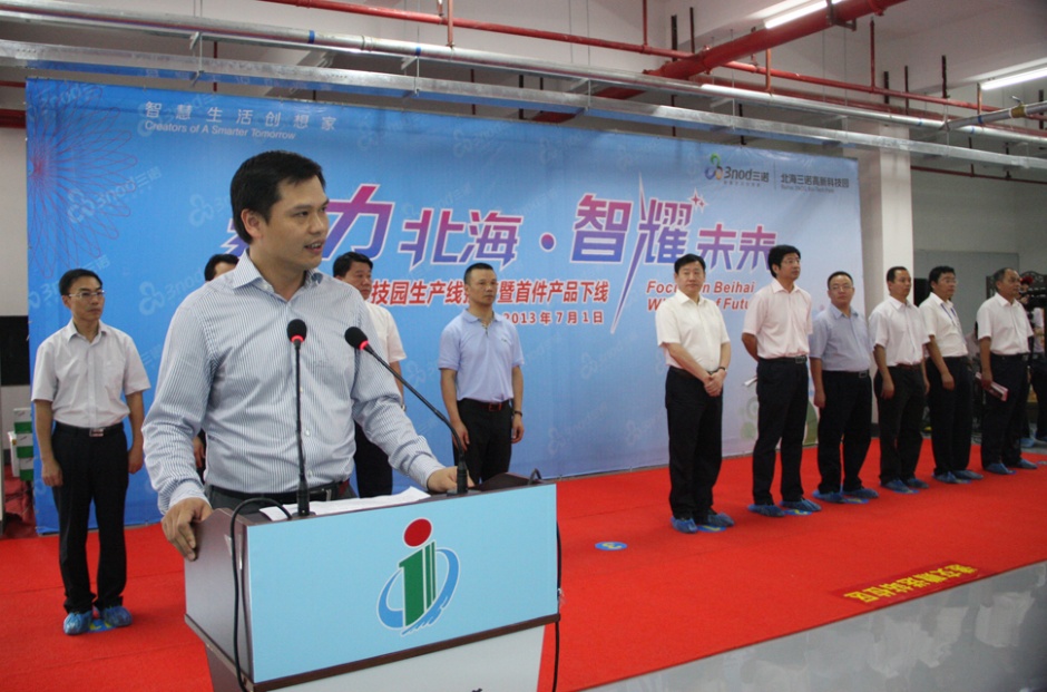 7月1日,三诺集团在广西北海迎来了北海三诺高新科技园生产线投产首件产品下线仪式。北海市委书记、人大常委会主任王小东、北海市委副书记、市长周家斌,市委常委、市委秘书长彭鸣达,副市长石昆等市领导出席仪式