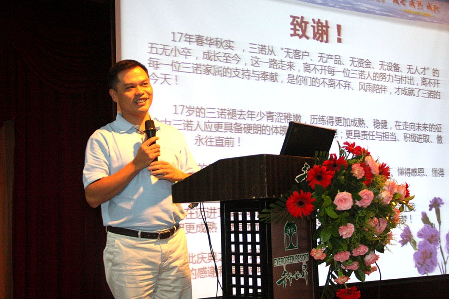 在三诺17周年庆典“成长?成熟?成就”的主题分享会上,回首携手走过的17年的风雨征程,全体三诺人思绪万千。董事长刘志雄热情致辞,他首先深鞠躬向三诺全体员工表达了诚挚的感谢,他说,三诺从“无客户、无产品、无资金、无设备、无人才”的五无小卒,成长至今,这一路走来,离不开每一位三诺人的努力与付出,离不开每一位三诺家属的支持与奉献,他认为,是全体三诺人的不离不弃、风雨陪伴,才成就了三诺的今天!刘董强调,17岁的三诺已褪去年少青涩稚嫩,历练得更加成熟、稳健,在走向未来的征途中,三诺人应更具备硬朗的体魄、睿智的思想;更具责任与担当、积极进取、傲立潮头、永往直前!