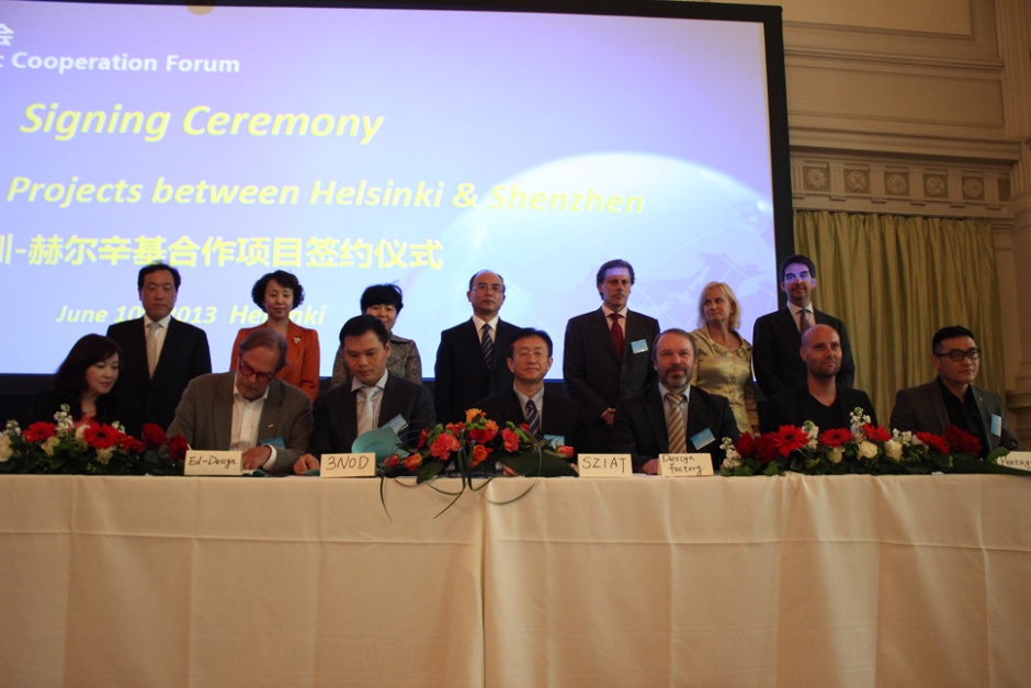 (图片1:在深圳-赫尔辛基经贸合作交流会上,深圳市工业设计行业协会会长、三诺数码集团董事长刘志雄(前左三)与芬兰Ed-Design设计公司创始人塔帕尼?哈瓦那(前左二)签订了三诺数码国际品牌策略机构项目。深圳市委副书记、市长许勤(后中一)、赫尔辛基大区投资促进局首席执行官弥迦?格兰德(后右三)、中国驻芬兰大使馆政务参赞陈雯女士(后左三)等出席签约仪式。)