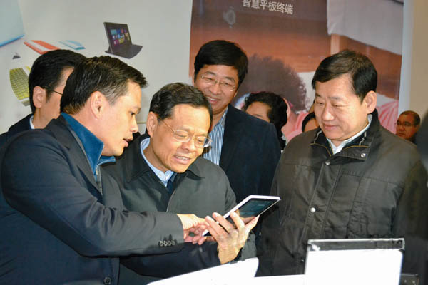 广西壮族自治区主席陈武在三诺智慧产业园了解生产情况,三诺集团董事长刘志雄展示了2013年12月出品的“广西造”第一款平板电脑