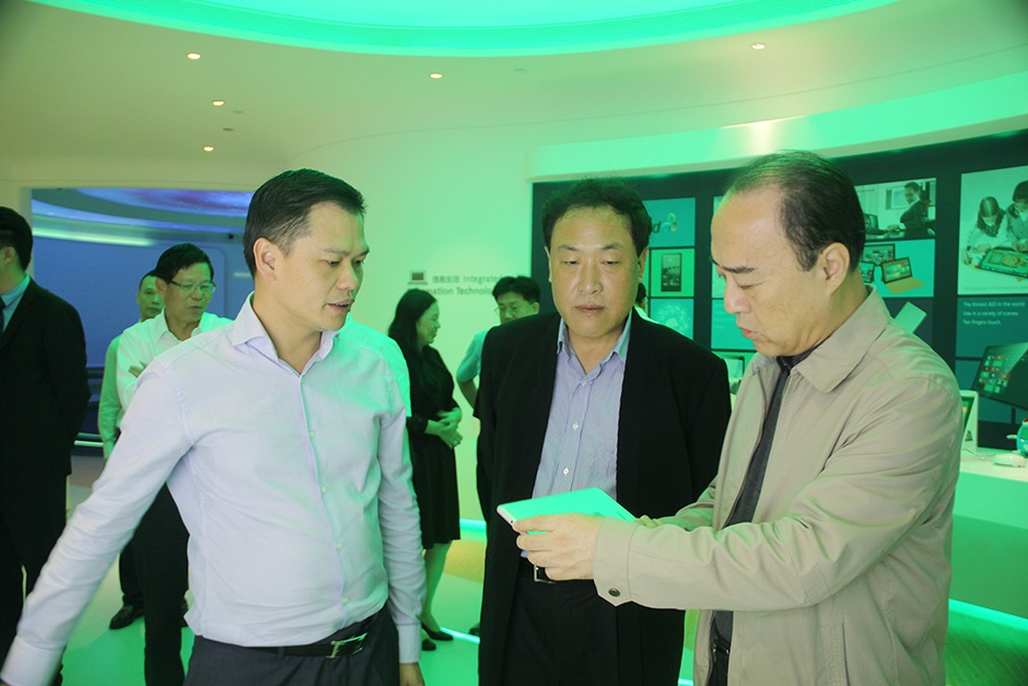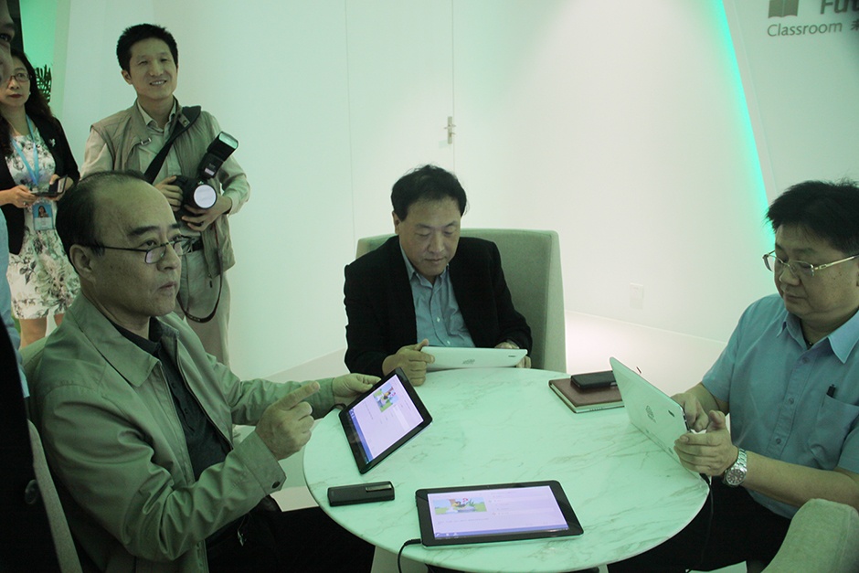 在“未来教室”,白天、郭立民等领导认真体验智慧教育平板终端,并表示值得在深圳进行推广