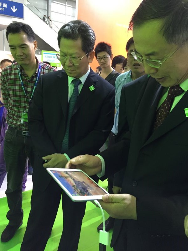 朱宏任总工程师和深圳市副市长陈彪先生在三诺展馆体验三诺最新研发的互动教育产品