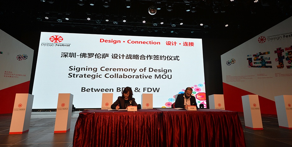 深圳市工业设计行业协会执行副会长兼秘书长封昌红女士代表深圳与佛罗伦萨签约代表,佛罗伦萨设计周CEO 亚历克斯?庞普先生进行了“深圳-佛罗伦萨设计战略”合作签约仪式