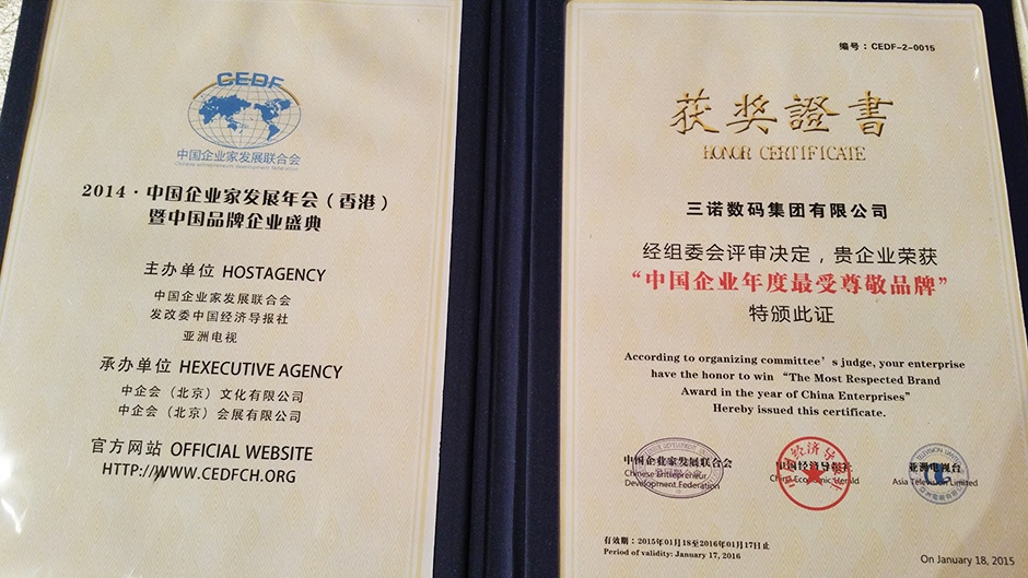 在本次年会上,三诺集团凭借“智慧生活创想家”的品牌定位,为未来智慧生活提供整体解决方案的努力与贡献,荣膺2014年度“中国企业年度最受尊敬品牌”,三诺集团董事长刘志雄亦获选“中国企业年度最具影响力品牌人物”。