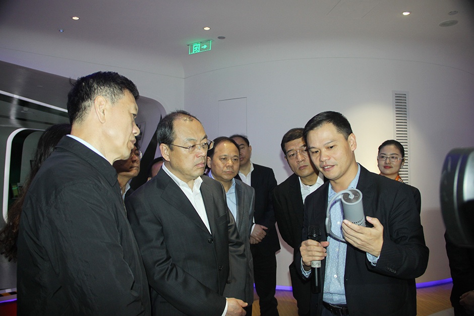 在智慧生活创想馆时代智造馆,三诺集团董事长刘志雄向阮书记等领导介绍三诺研制的IT音响产品