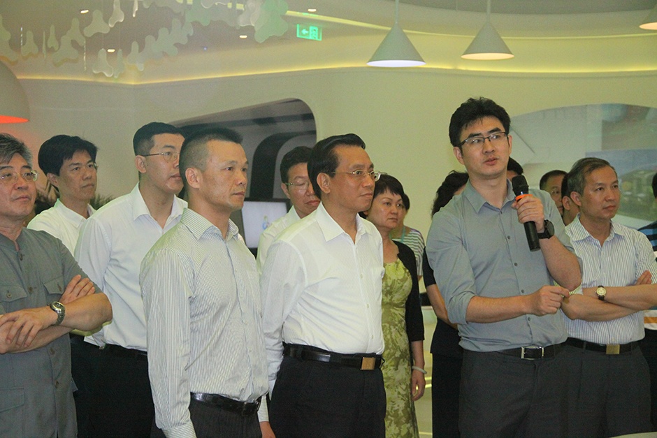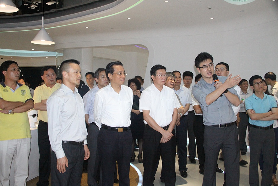 三诺集团副总裁刘志强、蓝筹科技总经理乔峤陪同陈市长一行参观智慧生活创想馆未来教室,对三诺开发的智慧教育平板赞赏有加。