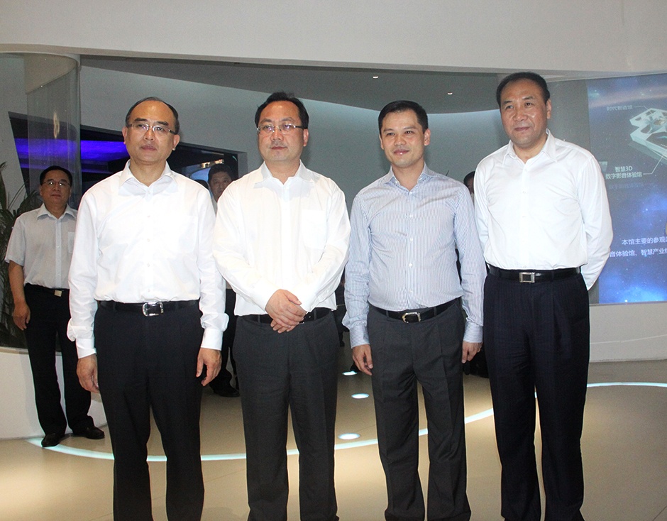 大连市委书记唐军(左二)、深圳市长许勤(左一)、大连市长肖盛峰(右一)、三诺集团董事长刘志雄(右二)在深圳智慧生活创想馆序厅智能相机前合影留念