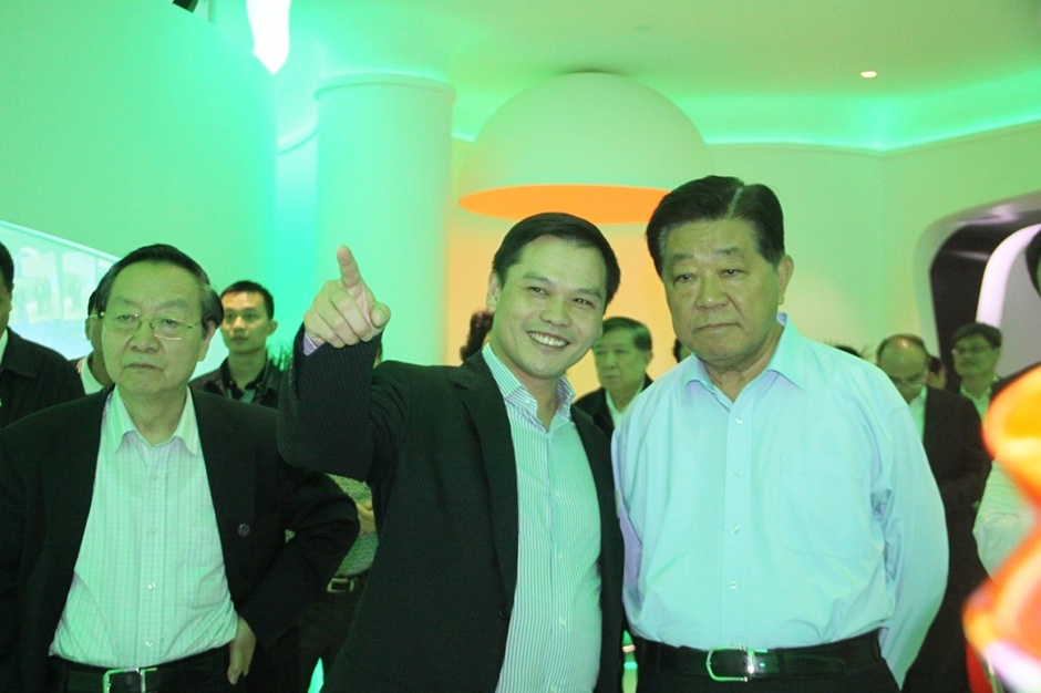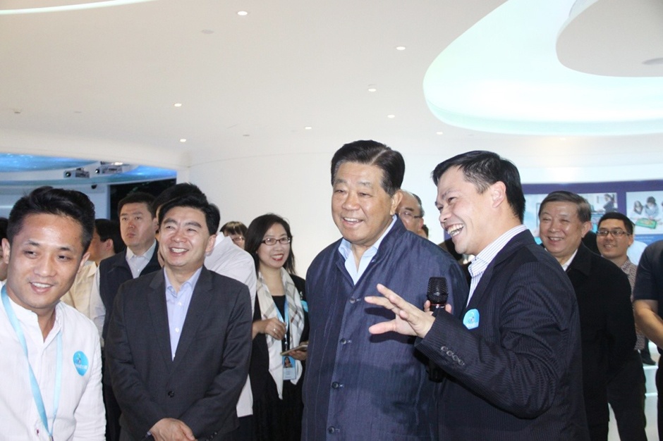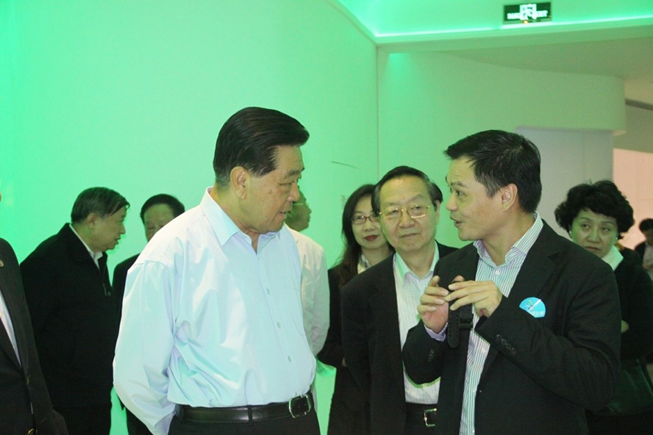三诺集团董事长刘志雄向贾庆林一行介绍未来生活创想馆的奇思妙想