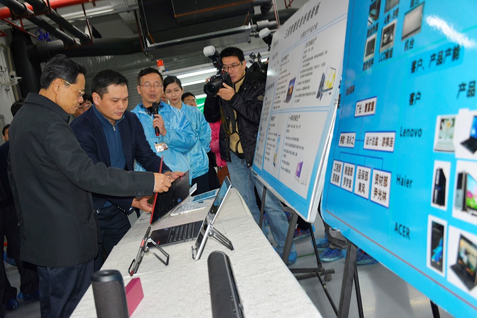 当主席听到刘志雄董事长汇报到2015年度广西三诺出口达到1.5亿美元,同比2014年增长3倍;2016年计划实现出口目标7亿到10亿美元时,陈武主席充分肯定了三诺的成绩,鼓励三诺一定要坚持快速发展思路,迎难而上,加大产业投入,为实现打造北海千亿元电子信息产业做出更大贡献。随后陈武主席等领导一行前往C02栋二楼电脑总装车间参观联想笔记本电脑生产线及海尔电脑生产线。