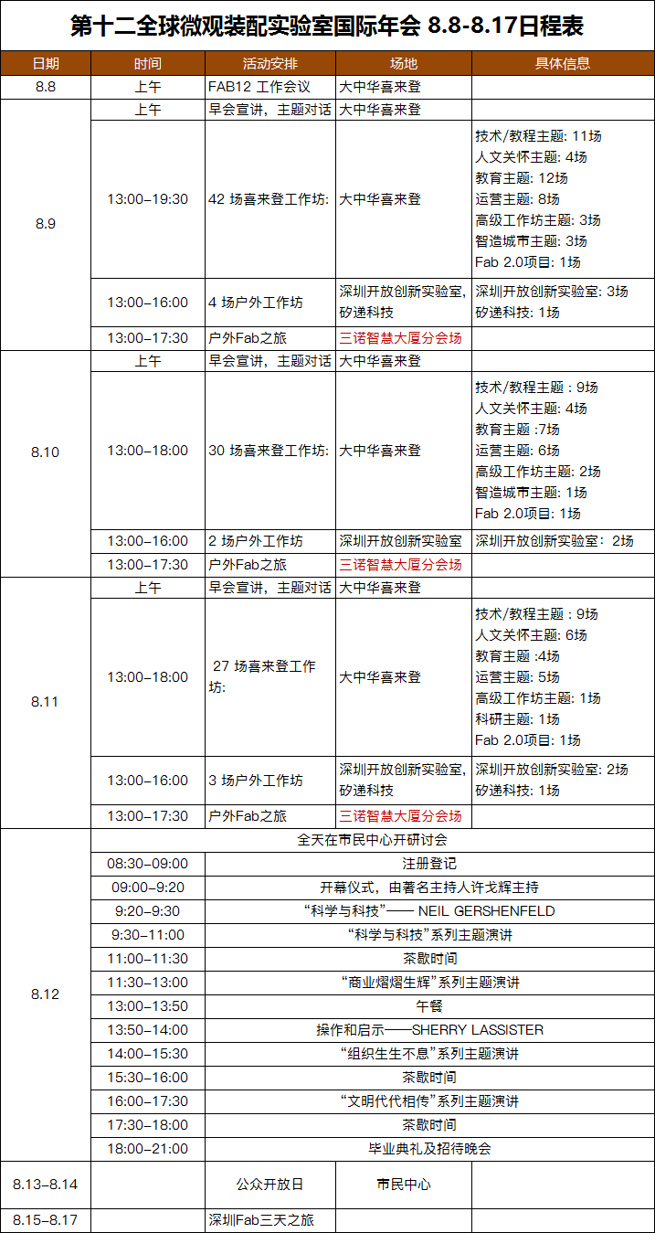 FAB年会从2004年至今,已举办过十一届。2016年第十二届举办城市落户深圳,为首次在中国举办。届时,全球Fab Lab网络成员将第一次齐聚深圳,一探全球创客天堂的风采魅力。第十二届全球微观装配实验室国际年会主题为Fab Lab 2.0“智造未来”(Fabricating the Future,指能够自行生产其他机器或生产工具从而实现可持续运转,深圳也将利用自身的创客发展优势携手国际创客精英共建可持续的主动创新环境),将聚集超过全球700个Fab Lab网络成员,来自55个不同的国家地方的2000名Fab lab管理者、核心成员、各领域科学家、技术工程师及工作者。通过展览展示、主题论坛、创客对话、工作坊、项目演示、创客之旅、FAB12公众开放日等多种形式,展示当下最先进的技术和创新成果。