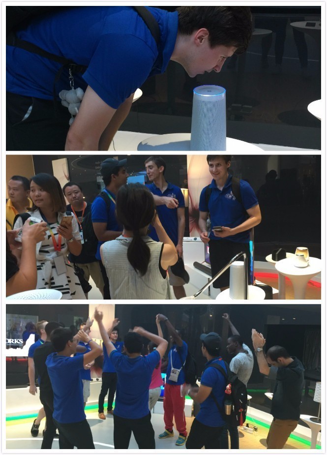 深圳智慧生活创想馆,由三诺智造的云智慧音响“叮咚”吸引了所有选手的目光,“来一首张学友的歌”、“2+3等于几”、“你知道汉语桥吗”……他们一个接一个不停地向“叮咚”发问,调戏“叮咚”。不过一般的问题可难不倒“叮咚”,选手们纷纷惊叹:“叮咚”太聪明了!伴随着“叮咚”悠扬的歌声选手们围成一个圆圈翩翩起舞,high翻全场。