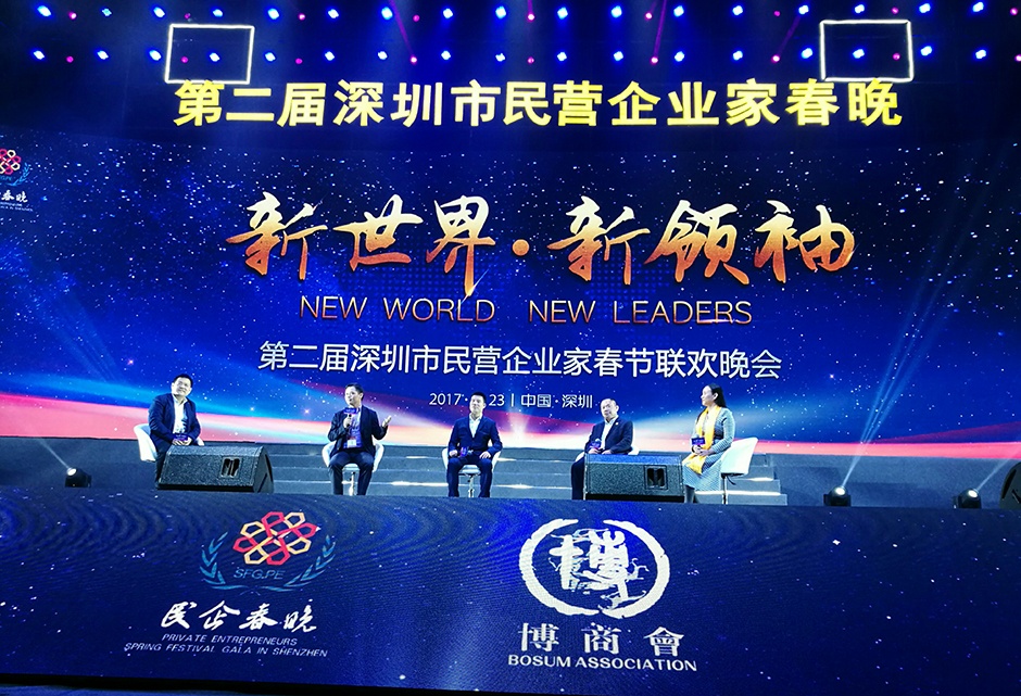2017年2月23日,由博商会主办、以“新世界o新领袖”为主题的第二届深圳民营企业春节联欢晚会在宝安体育馆隆重举行。深圳市市委统战部副部长、市工商联党组书记蔡立携政府领导班子出席盛会。