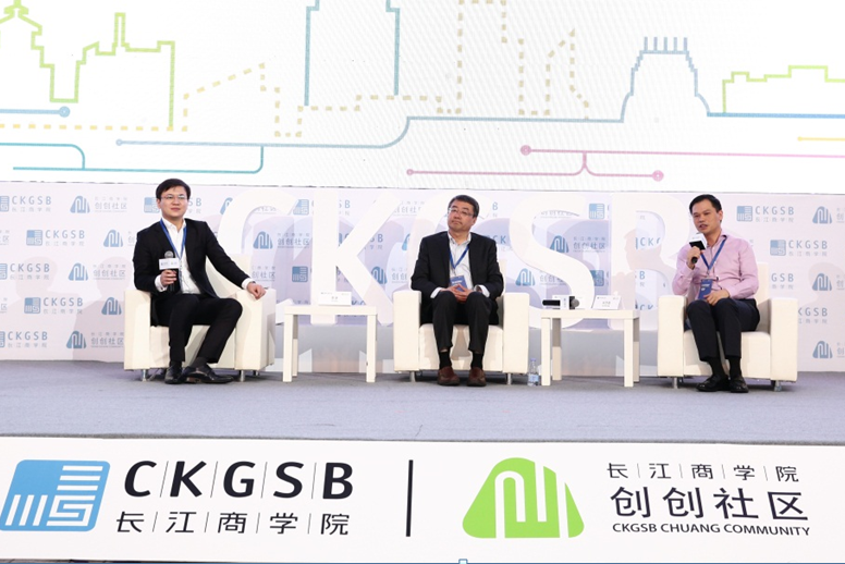 在随后的巅峰对话环节,长江商学院教授李洋担任议题主席,与三诺集团董事长兼CEO、长江商学院深圳校友会会长刘志雄,真格基金联合创始人、新东方联合创始人、长江商学院DBA学员王强,就【科技×商业】话题展开了精彩讨论。