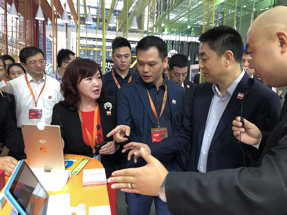 展会开幕式结束后,工业和信息化部产业政策司副司长于晓东在深圳市副市长高自民的陪同下莅临三诺展台参观考察,展台现场负责人、三诺工业设计中心品牌总监阴鹏为来访领导详细介绍了Lockbook智能笔记本、知慧本、AR绘本等创新智慧产品,赢得现场一片赞许。