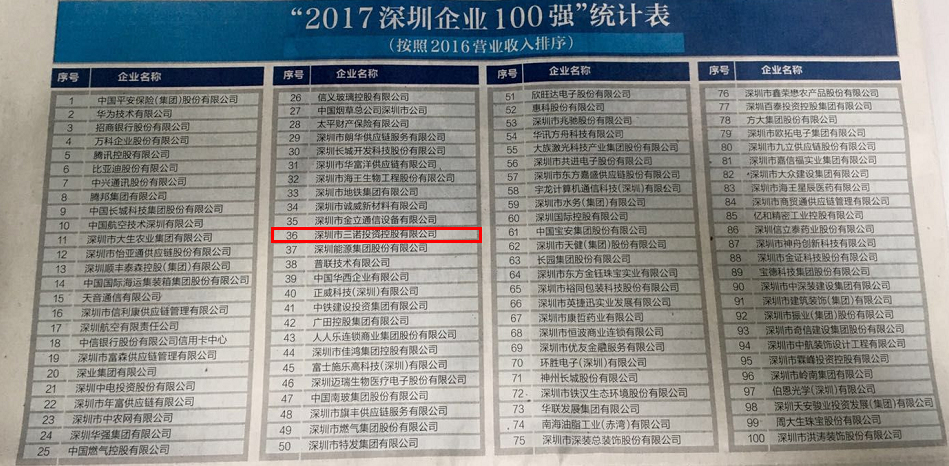 由深圳市企业联合会与深圳商报共同主办的“2017深圳企业100强”排行榜日前公布,三诺凭借卓越的实力入围榜单,位列第36位,较去年上升9位!