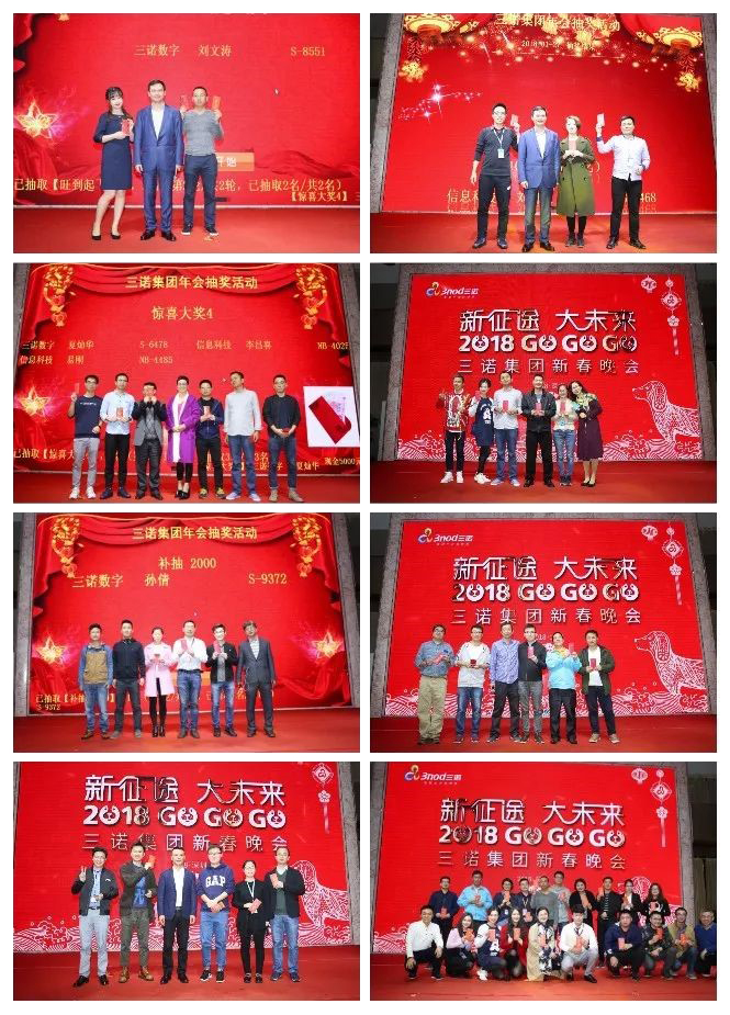 精彩的节目轮番上演,而最激动人心的莫过于晚会的抽奖环节。现场准备了丰厚的奖金,丰富的礼品,让每个员工都迫不及待,翘首以盼。在一声高过一声的欢呼声中,大奖依次开出,现金奖的抽取更是将整场晚会的热烈气氛推向了最高潮。最后,在众人的美好祝福声中,三诺“新征途 大未来 2018 GO GO GO!”迎春晚会圆满落下帷幕。