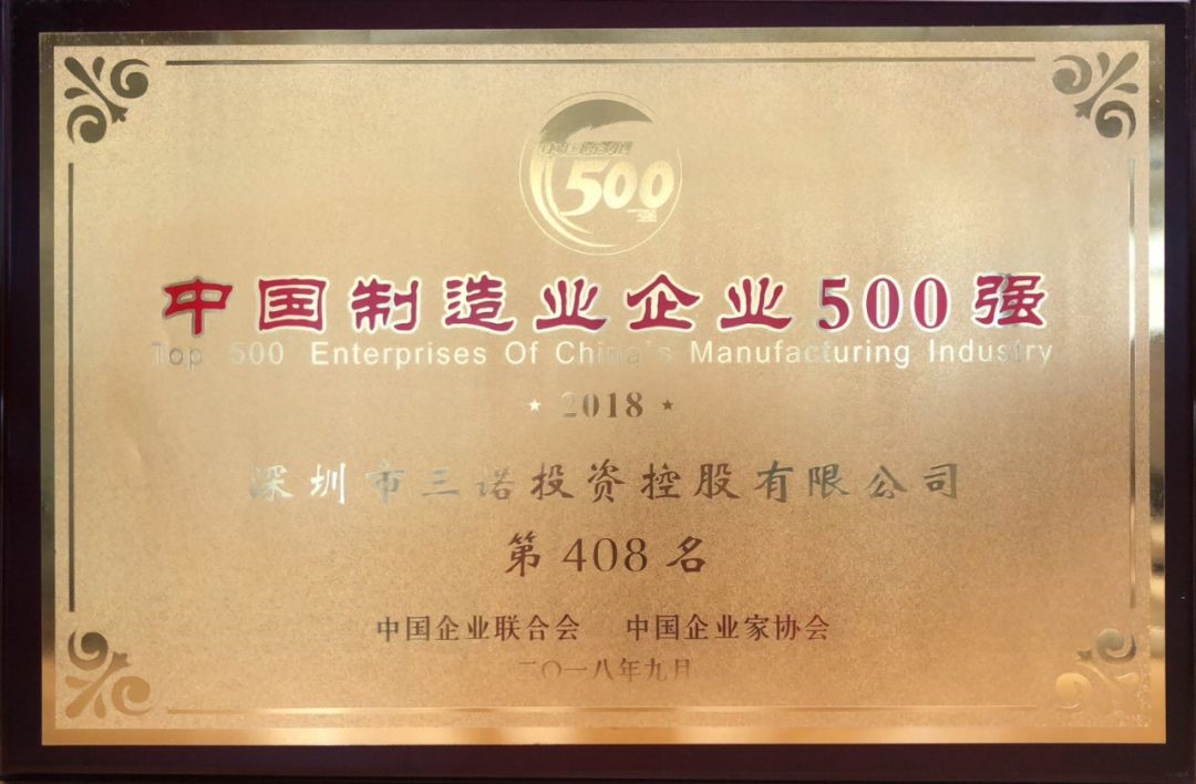 近日,在2018中国500强企业高峰论坛上,中国企业联合会、中国企业家协会向社会发布了“2018中国制造业企业500强”榜单,三诺集团凭借卓越实力入选该榜单,位列第408名。