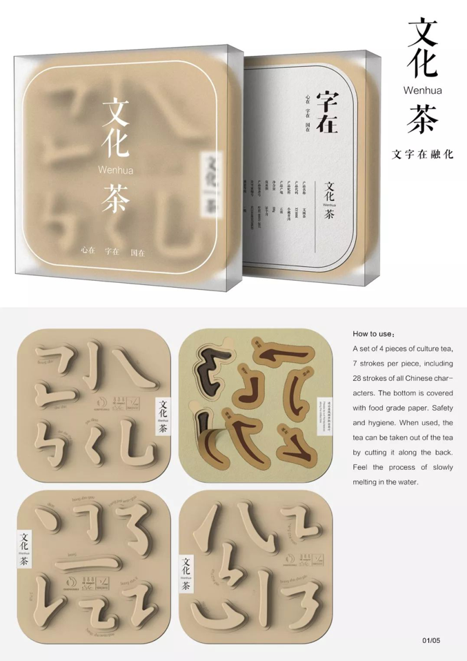 “文化茶”为全球孔子学院打造,旨在传播汉字文化。汉字是延续文化的根脉,而笔画是组成汉字的最小单元。选取28个具有代表性的汉字笔画与甄选普洱茶品结合。在品饮的同时感受笔画在茶汤中慢慢消散的即逝感。“文化茶”包装采用 “活字印章”概念。萃取小麦秸秆原浆,可完全降解。废弃包装可以作为一种教学工具,帮助特殊人群学习汉字笔画。“文化茶”解构了汉字美学,赋予了茶的年轻态,打通传统与现代的关系,展示国人精神志气,提振中华民族文化自信。