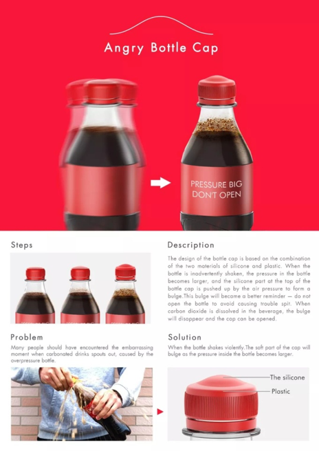 许多人喝碳酸饮料的时候应该都遇到过,无意间打开瓶内气压过大的瓶盖,然后饮料喷出造成的尴尬时刻。本瓶盖的设计基于硅胶与塑料两种材质的结合,当无意间晃动碳酸饮料瓶子,瓶内气压变大之后,瓶盖顶部的硅胶部分就会被气压顶起,形成一个凸起的鼓包,这样就能更好的提醒人们,不要打开瓶盖,避免喷出造成麻烦。待二氧化碳气溶于饮料中,凸起的鼓包会下沉消失,此时就可以开启瓶盖饮用了。