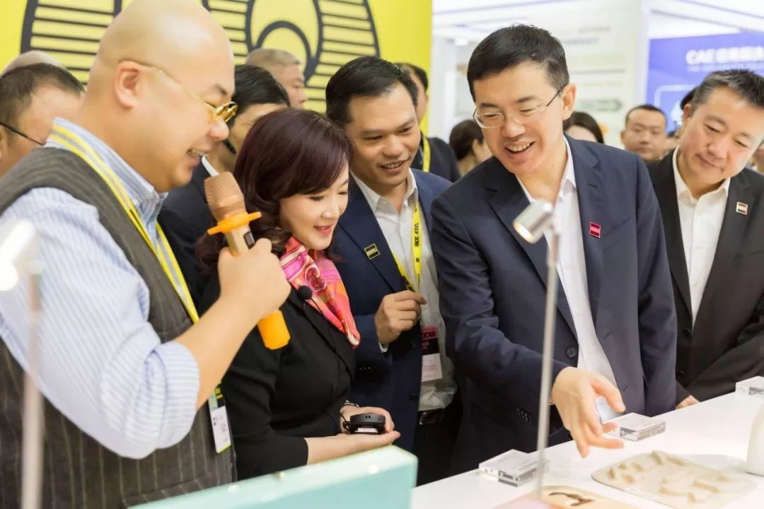11月5日大展第一天,深圳市副市长艾学峰(右二)在深圳市工业设计行业协会会长、三诺集团董事长刘志雄(右三)的陪同下参观三诺展区