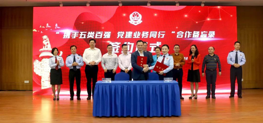 宝安区税务局党委书记、局长熊为与宝安区五类百强企业联合会会长刘志雄共同共同签署《“携手五类百强 党建业务同行”合作备忘录》