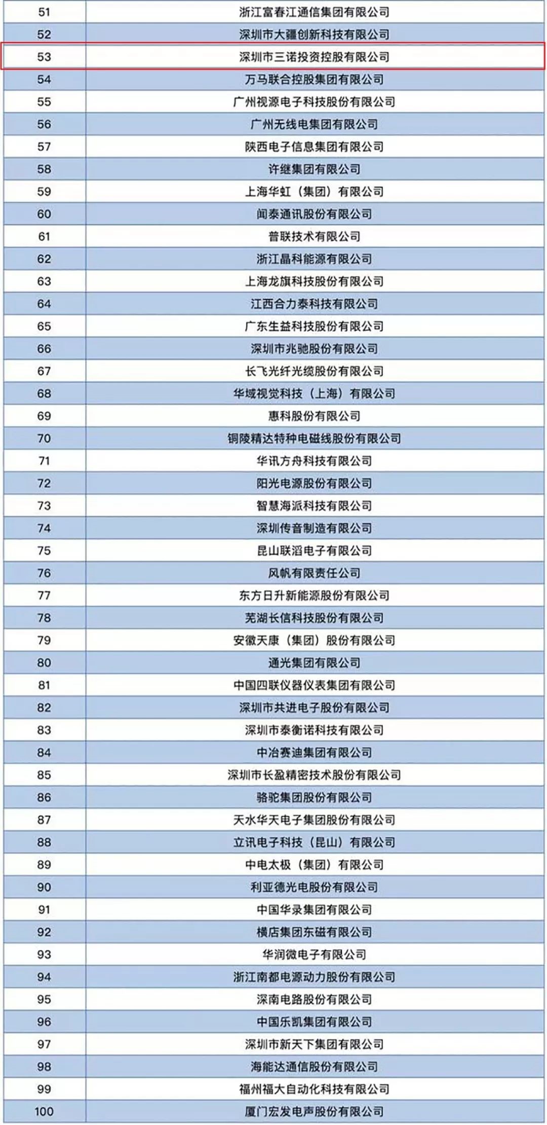 7月18日,2019年(第33届)电子信息百强企业发布会暨产业发展高峰论坛在天津滨海新区召开,会上发布了2019年(第33届)电子信息百强企业榜单,其中,22家深圳企业挺进中国电子信息百强。深圳市三诺投资控股有限公司凭借卓越实力荣登榜单,并荣列第53位,这是三诺第二次入围该榜单。