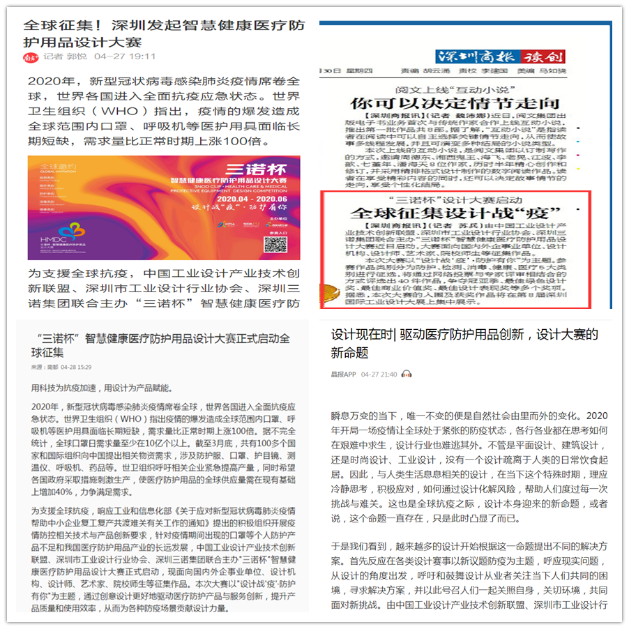为支援全球抗疫,响应工业和信息化部《关于应对新型冠状病毒肺炎疫情帮助中小企业复工复产共渡难关有关工作的通知》提出的积极组织开展疫情防控相关技术与产品创新要求,针对疫情期间出现的口罩等个人防护产品不足和我国医疗防护用品产业的长远发展,由中国工业设计产业技术创新联盟、深圳市工业设计行业协会、深圳三诺集团联合主办“三诺杯”智慧健康医疗防护用品设计大赛正式启动,现面向国内外企事业单位、设计机构、设计师、艺术家、院校师生等征集作品。本次大赛以“设计战‘疫’?防护有你”为主题,通过创意设计更好地驱动医疗防护产品与服务创新,提升产品质量和使用效率,从而为各种防疫场景贡献设计力量。