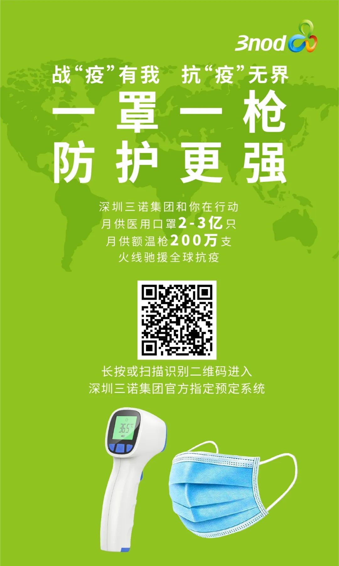 深圳三诺集团和你在行动,月供医用口罩可达2-3亿只,月供“精准测温 仅需一秒”的红外额温枪可达200万支。深圳三诺集团之所以能快速响应,火速驰援全球抗疫,是因为早在2019年初就布局了智慧健康产业,以智能制造业为根基,正式探索科技赋能健康产品领域,深入布局涵盖“智慧工作、智慧出行、智慧家庭、智慧教育”在内的智慧健康防疫产品领域,用科技的手段研发生产了移动语音会议办公系统、有温度传感的个人穿戴设备、非接触式的刷脸智能设备、杀毒的居家产品等一系列防疫产品线,实现健康产品的多场景化覆盖,致力于打造成为全球健康产业的标杆企业。