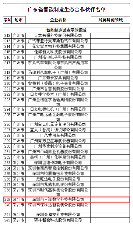 4月9日,广东省智能制造生态合作伙伴行动计划实施启动会在中山举行,首批广东省智能制造生态合作伙伴名单公布,共有303家单位入选。深圳50家企业入选,深圳市三诺数字科技有限公司榜上有名。