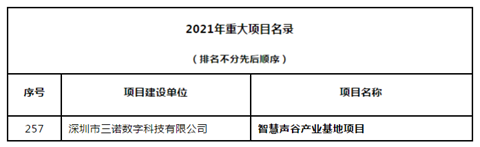 5月28日,深圳市发改委正式对外发布《深圳市2021年重大项目计划》,共有536个项目上榜,涉及交通、能源、产业、教育、医疗、城市更新、文化设施、总部基地等方面,总投资28264.9亿元。其中,由深圳市三诺数字科技有限公司(以下简称三诺数字)打造的“智慧声谷产业基地项目”光荣入榜。