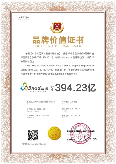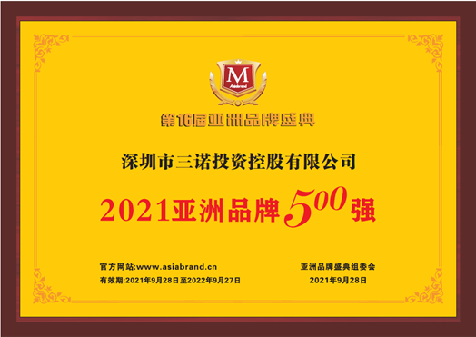 9月28日,由专业品牌评价机构Asiabrand(亚洲品牌集团)发起主办,中国亚洲经济发展协会、一带一路总商会、《环球时报》社、澳门商报、东盟-中国工商总会、亚太第一卫视联合主办的第16届亚洲品牌盛典在海口市举行,体现亚洲企业整体品牌实力的2021“亚洲品牌500强”价值榜在盛典上隆重发布。三诺集团以雄厚的品牌实力连续多年榜上有名,以394.23亿元的品牌价值位列排行榜第383名。