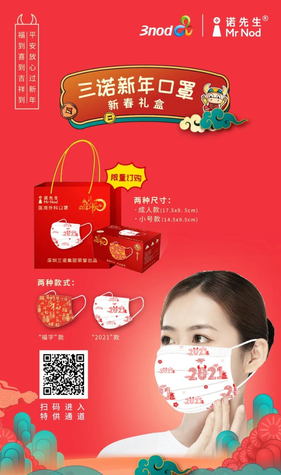 牛年春节送平安、送温暖、送喜庆,三诺推出中国红“新年口罩礼盒”。