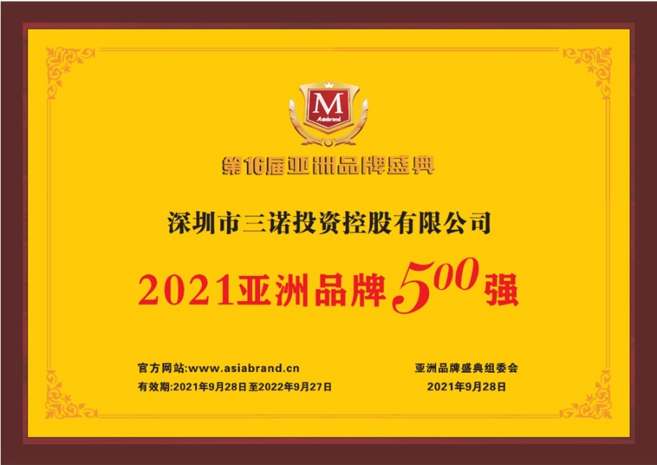 9月28日,第16届亚洲品牌盛典在海口市举行,盛典重磅发布了“2021亚洲品牌500强”榜单,三诺集团以394.23亿元的品牌价值蝉联“亚洲品牌500强”。