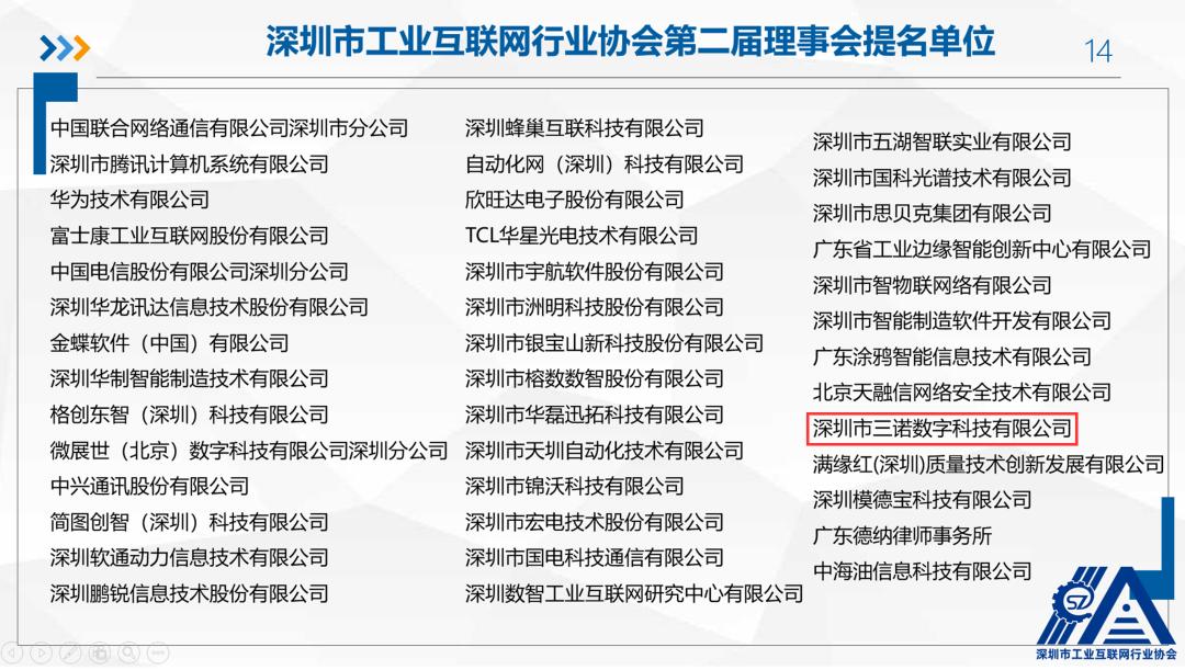 为实现加快打造全球先进制造业中心目标,推动深圳制造业高端化、智能化、绿色化发展的高质量发展愿景,由深圳市工业互联网行业协会主办、深圳市工业互联网行业协会CIO专委会、IT部落承办、深圳市宝安区工业互联网行业协会联合承办的“2023大湾区(深圳)工业互联网峰会暨大湾区数字化峰会”在深举行。会上宣布,深圳市三诺数字科技有限公司(简称三诺数字)入选“深圳市工业互联网行业协会第二届理事会”提名单位。