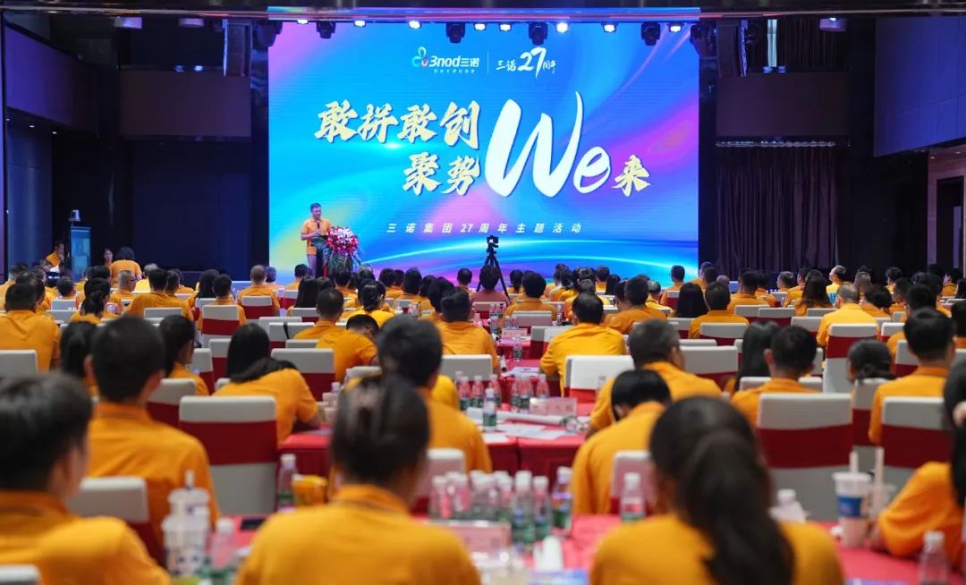在金桂飘香、硕果满枝的丰收时节,三诺迎来了27周岁生日。27年,三诺走过峥嵘岁月,依旧破浪乘风,不断超越!今年也是三诺的丰收年,我们迎来了中共中央政治局常委、国务院总理李强的考察和点赞。一年一度的思想盛宴——“敢拼敢创 聚势We来”三诺集团27周年主题活动如约而至,集团董事长兼CEO刘志雄、集团常务副总裁兼三诺信息科技CEO熊辉、三诺数字CEO刘江涛、各事业部及总部平台主要干部员工参会。大会在深圳总部三诺智慧大厦召开,北海、凭祥、越南园区视频连线参与。