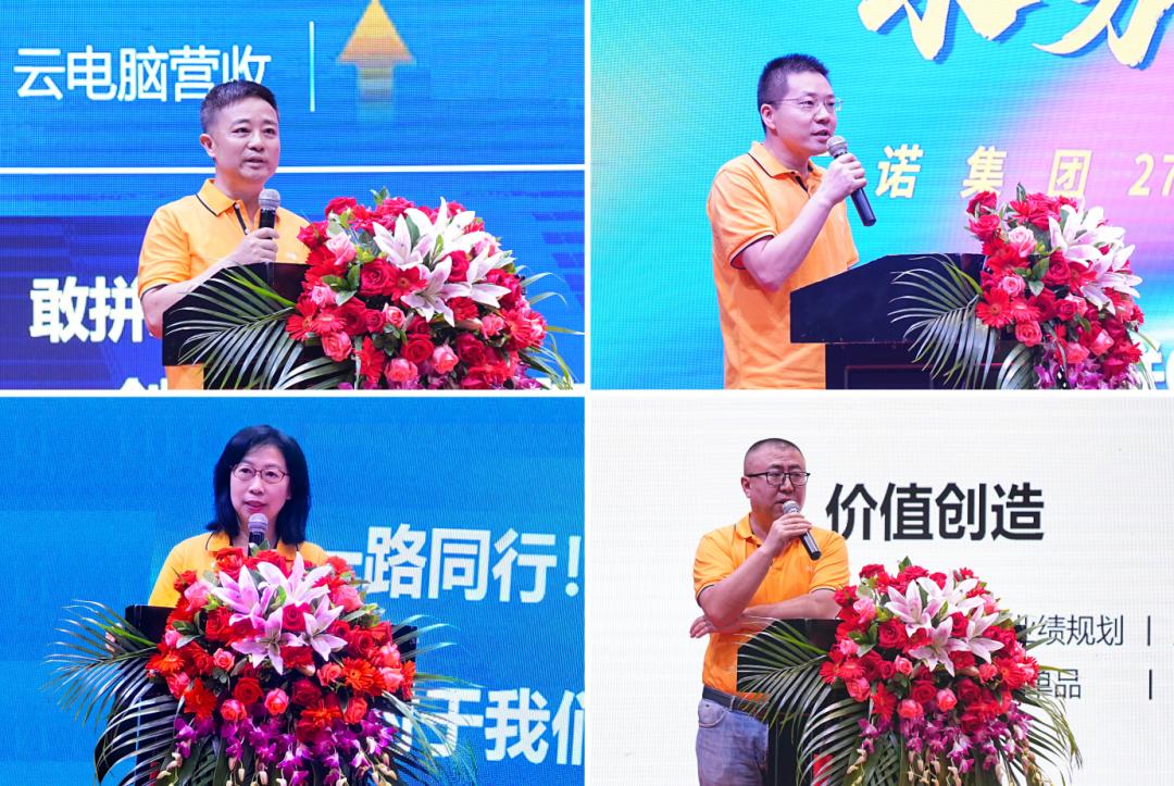 这是一场检讨工作、发起冲刺的动员会。刘董强调,我们要以目标为驱动,不断设立目标、实现目标、然后超越目标,这才是价值和梦想实现的正确打开方式。刘董带领大家反省了我们存在的经营问题,回顾了“守正、拓新、致远”2023经营主题以及3大主要平台经营目标,点赞三诺声智联、三诺信息科技、三诺电子等BU取得了进步,日胜一日,并再次号召大家:为达成千亿目标,我们要饱含激情,吹响战斗的号角,深耕3大模式实施3331工程,走差异化、生态化、数字化发展路径,链接黑科技、创新力、大模型、新场景,构建国际化智能产业创新生态平台。我们要做坚定的长期主义者,去乐观地创想,严谨地计划,坚决地执行。