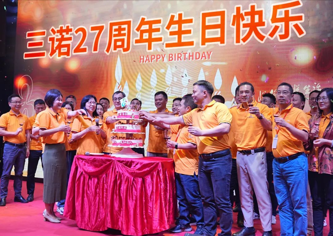 27年来,三诺一直深耕科技与制造,始终不忘初心,砥砺前行,从一家传统模具厂成长为以智慧生活为核心的多品类高科技智慧企业。未来,三诺将走差异化、生态化、数字化发展路径,链接黑科技、创新力、大模型、新场景,构建千亿级的国际化智能产业创新生态平台。再出发,上新阶。在27周年生日这个美好时刻,集团领导上台和全体三诺人齐为三诺庆生,祝福三诺生日快乐,越来越好!祝福三诺蒸蒸日上,蓬勃发展!祝福三诺穿越周期,永续经营!