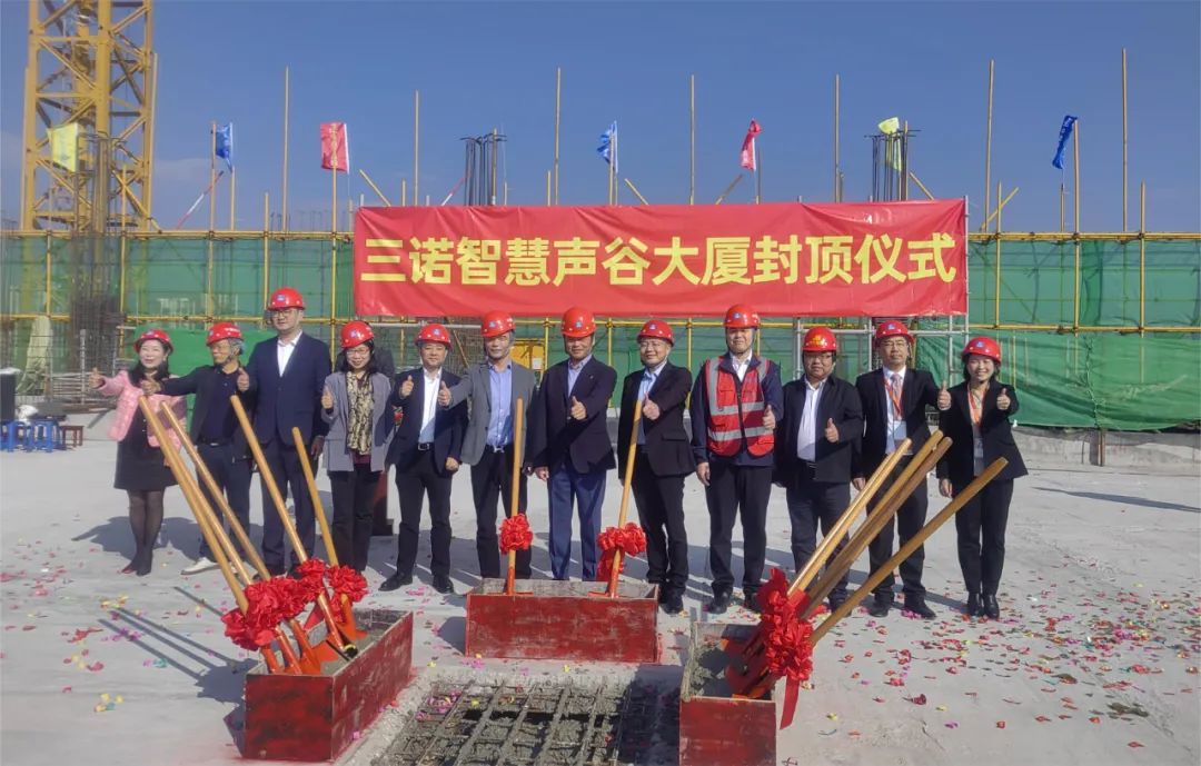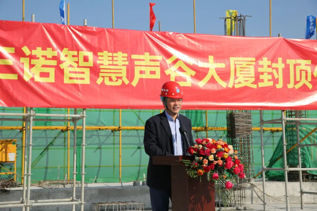 项目建设工地彩旗飘扬,高耸的大楼悬挂着喜气洋洋的祝福语,洋溢着浓郁的喜庆气氛。封顶仪式上,三诺集团董事长刘志雄向一直以来支持项目的各级政府部门和领导,向风雨兼程坚守工程建设的全体工作人员致以诚挚的谢意。同时表示,三诺智慧声谷是响应政府"工业上楼"的重大项目,是宝安在建的数字化灯塔工厂,也是三诺为助力"中国制造"走向"中国创造"交出的一个答案,对速度和品质的要求非常高,主体结构封顶仅仅是完成了第一步,后续的任务还很繁重艰巨,希望进一步严把质量关、安全关,进度关,确保三诺智慧声谷如质如期交付,把这个政府高度重视、领导高度关心、社会高度关注的"工业上楼"项目打造成为标杆工程、精品工程。