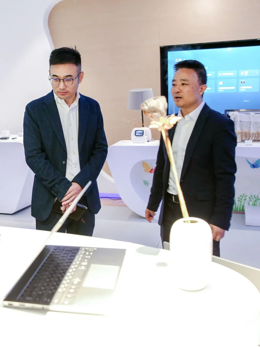 签约前,在熊辉的陪同下,美高电子领导一行参观了三诺智慧生活创想馆,并饶有兴趣地体验了三诺智能信息终端、智慧教育产品及声音++、智能穿戴、AIoT等各类产品。