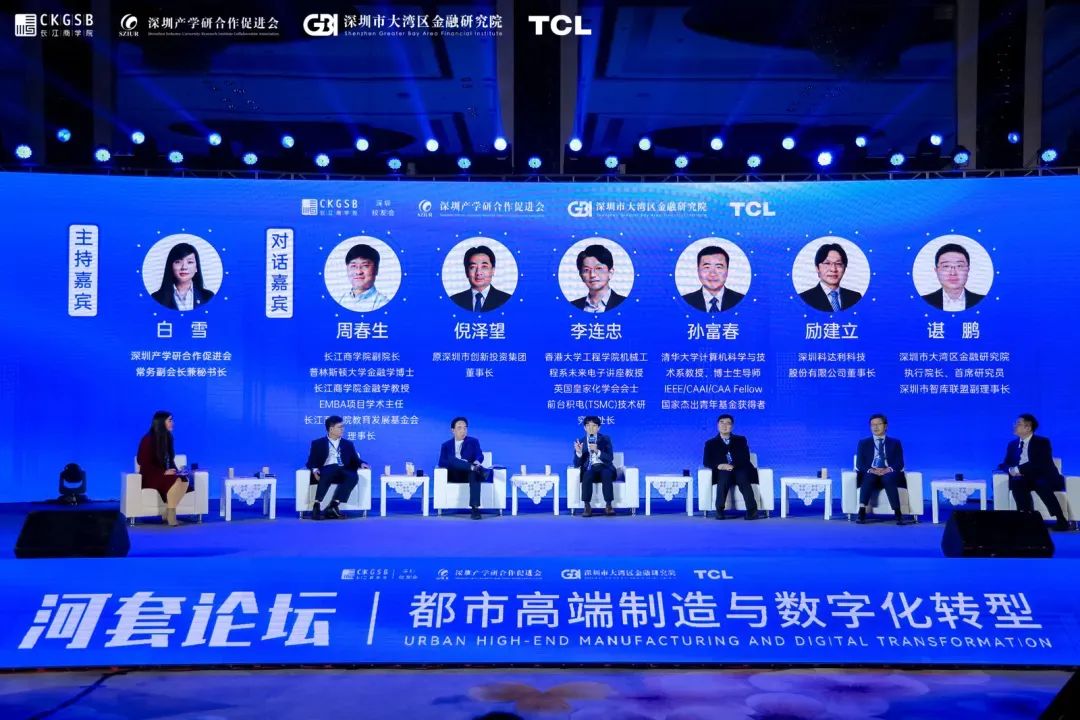 论坛最后,深圳产学研合作促进会常务副会长兼秘书长白雪作为主持人与长江商学院副院长、讲席教授周春生,原深圳市创新投资集团董事长倪泽望,香港大学未来电子讲席教授、前台积电(TSMC)技术研究处处长李连忠,清华大学计算机科学与技术系教授、博士生导师孙富春,深圳科达利科技股份有限公司创始人、董事长励建立,深圳市大湾区金融研究院执行院长、深圳市智库联盟副理事长谌鹏等6位嘉宾共同就制造业数字化转型新途径以及传统产业高质量发展新思路展开了讨论,活动现场气氛活跃。