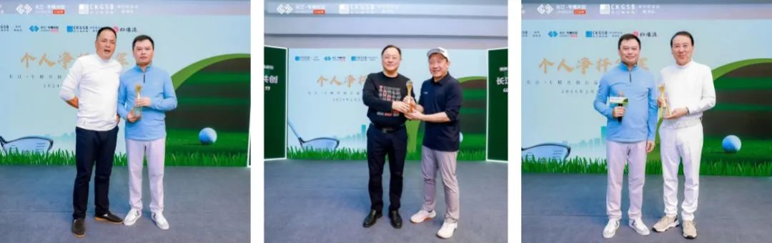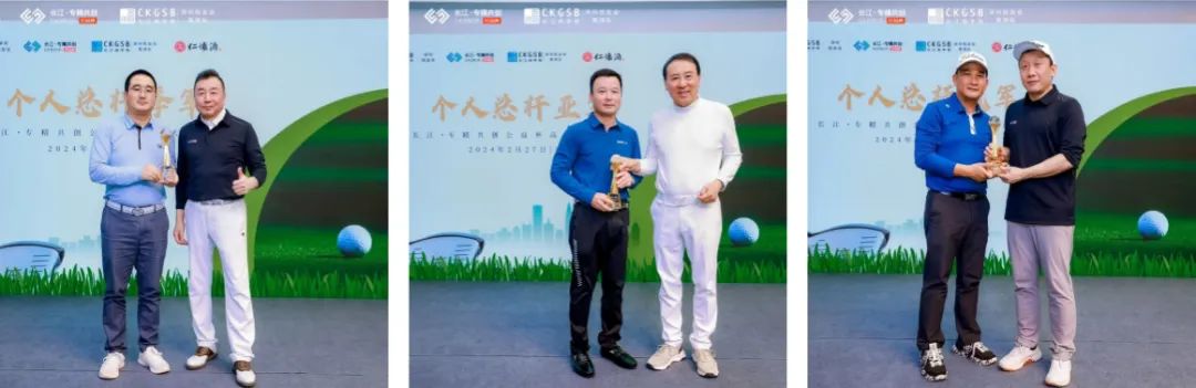 (图片从左至右)长江辽宁校友会会长姜放为张健颁发个人总杆季军奖;房超为高令奇颁发个人总杆亚军奖;李海涛院长为简次强颁发个人总杆冠军奖