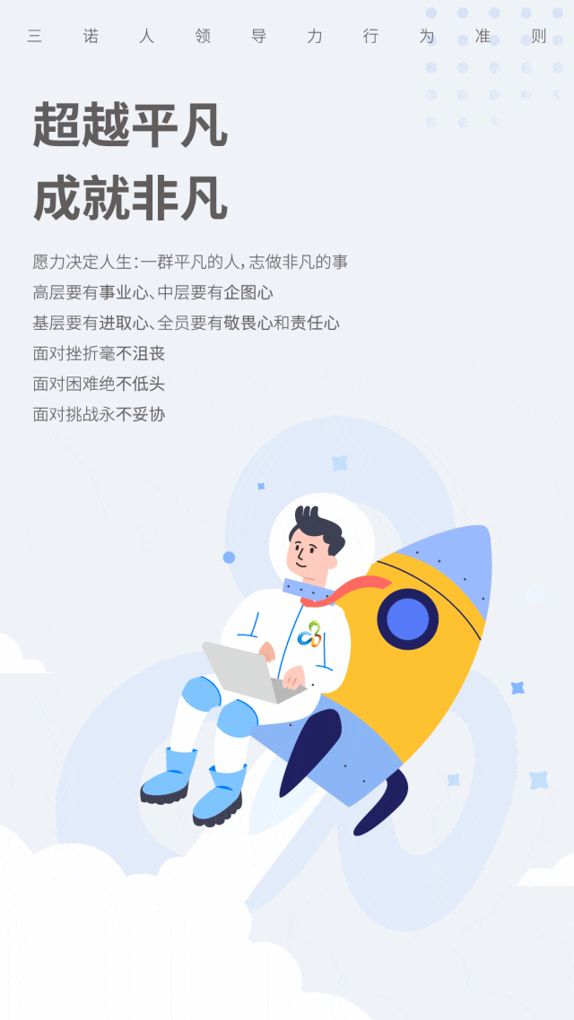 愿力决定人生。坚持三哲学、诺执行,以领导力行为准则为标准驱动自己不断精进,高层要有事业心、中层要有企图心、基层要有进取心、全员要有敬畏心和责任心;一群平凡的人,志做非凡的事,面对挫折毫不沮丧,面对困难绝不低头,面对挑战永不妥协;拒绝抱怨,绝不推诿,拒绝平庸,拥抱变化,心存远志,矢志前行,携手同心、全力以赴,点亮内心的激情,绽放生命的精彩,成就心中的梦想!我相信,我可以,我一定能做到!把不可能变成可能,超越平凡、成就非凡!