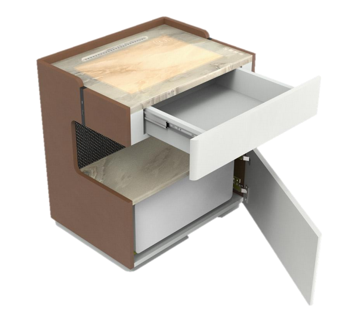 这款智能床头柜采用时尚轻奢的设计风格,线条流畅简洁,质感细腻,能够轻 松融入各种家居装修风格,无论是现代简约风,还是欧式典雅风,它都能成为卧室中的点睛之笔。同时,它内置了高品质的音响系统,音响经过专业调校,音质纯净、饱满,能够为用户带来沉浸式的音乐体验。在睡前,播放一首轻柔的音乐,帮助用户放松身心,快速进入甜美的梦乡。