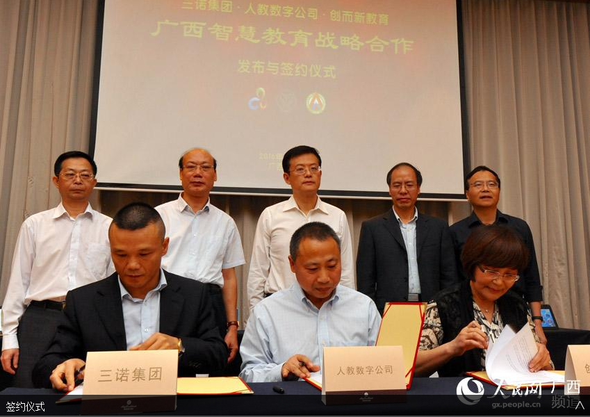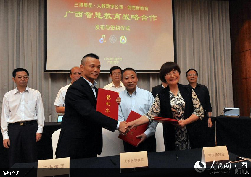 人民网南宁11月21日电 11月19日,三诺集团与人教数字公司、创而新教育在南宁签署了战略合作框架协议。三方将通过“人教PAD”智慧教育终端的研发制造、应用推广,全力推动广西智慧教育的发展。广西壮族自治区北部湾经济区和东盟开放合作办公室党组书记、常务副主任魏然,教育厅副厅长孙国友等到会表示祝贺。