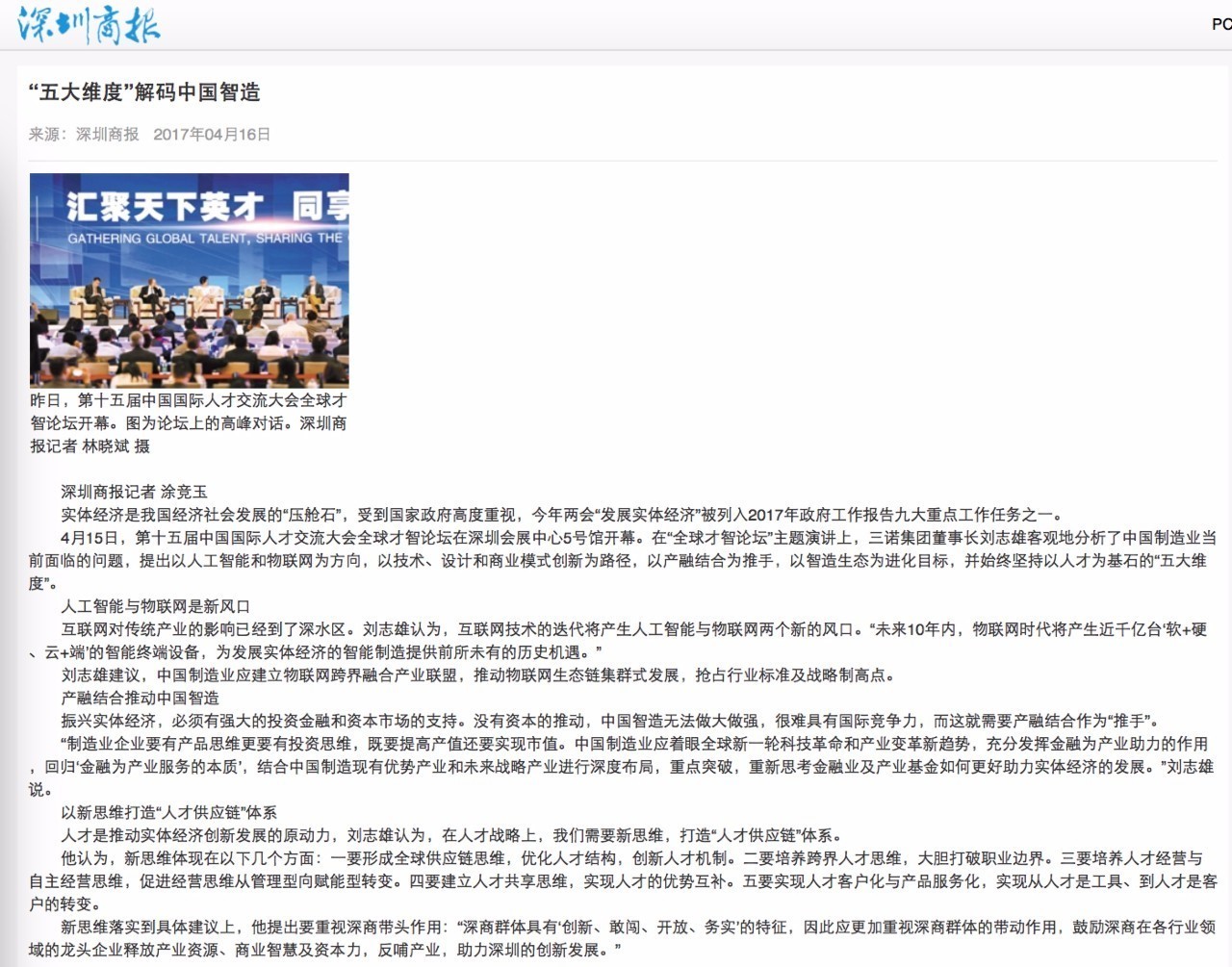 4月15日,第十五届中国国际人才交流大会全球才智论坛在深圳会展中心5号馆开幕。在“全球才智论坛”主题演讲上,三诺集团董事长刘志雄客观地分析了中国制造业当前面临的问题,提出以人工智能和物联网为方向,以技术、设计和商业模式创新为路径,以产融结合为推手,以智造生态为进化目标,并始终坚持以人才为基石的“五大维度”。