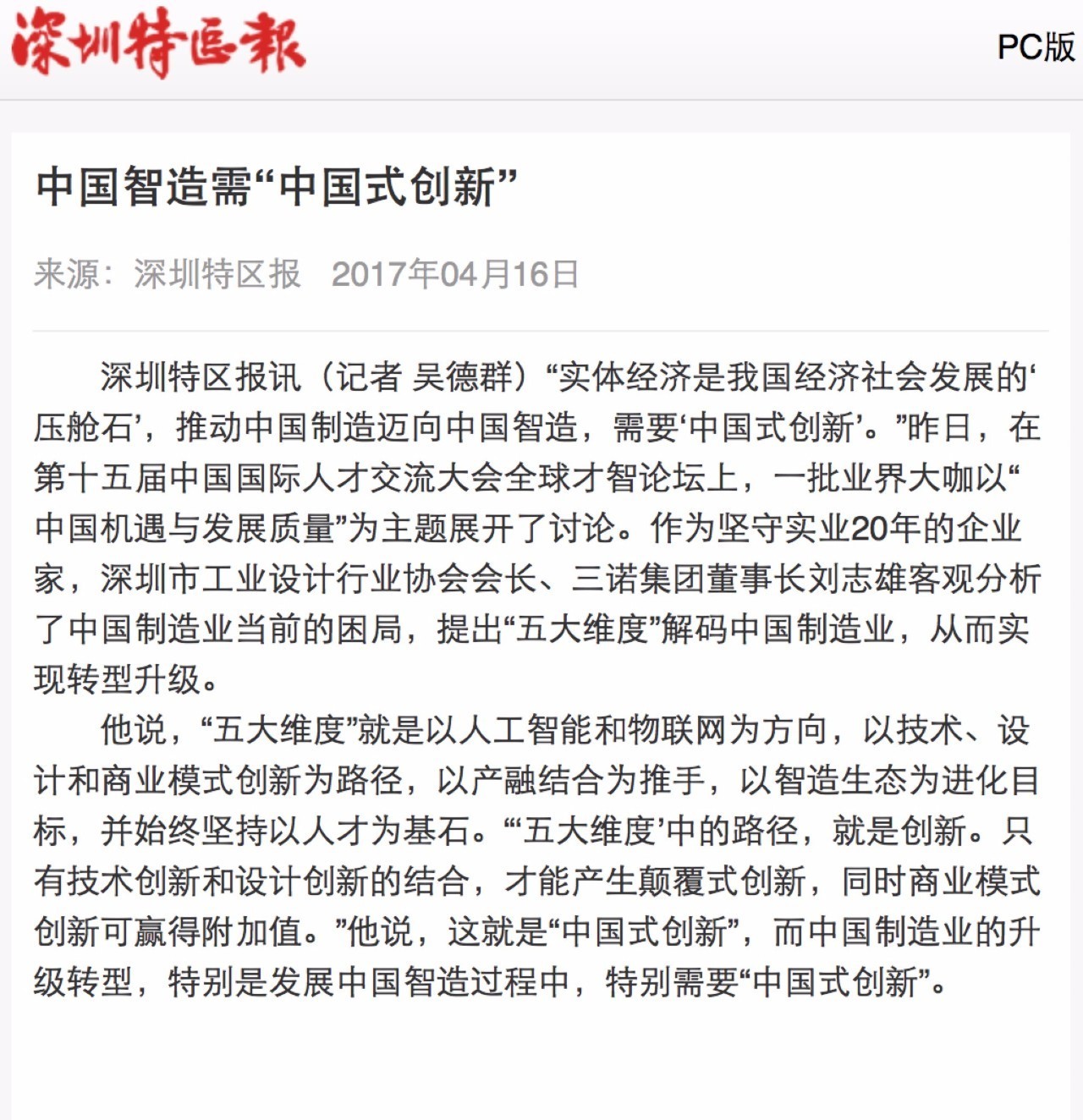 深圳特区报讯(记者 吴德群)“实体经济是我国经济社会发展的‘压舱石’,推动中国制造迈向中国智造,需要‘中国式创新’。”昨日,在第十五届中国国际人才交流大会全球才智论坛上,一批业界大咖以“中国机遇与发展质量”为主题展开了讨论。作为坚守实业20年的企业家,深圳市工业设计行业协会会长、三诺集团董事长刘志雄客观分析了中国制造业当前的困局,提出“五大维度”解码中国制造业,从而实现转型升级。